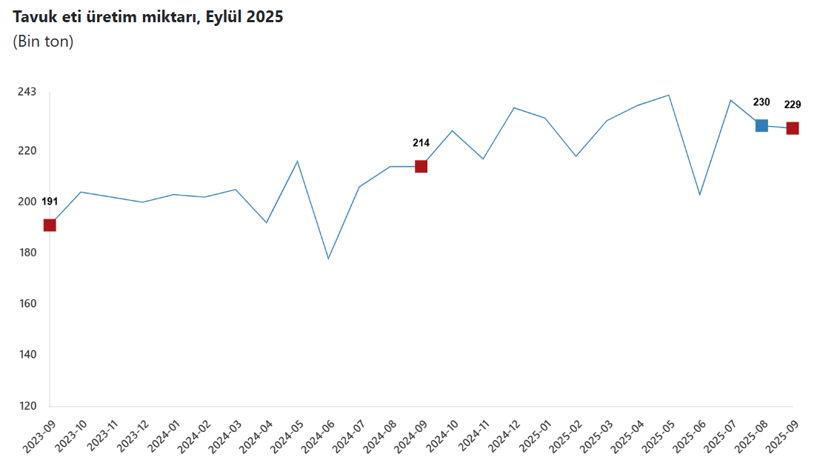 Aylık değişimlere bakıldığında, Ağustos ayında 229 bin 965 ton olan tavuk eti üretimi Eylül’de yüzde 0,5 düşüşle 228 bin 846 tona geriledi. Tavuk yumurtası üretimi ise bir önceki ay 1 milyar 679 milyon 706 bin adet seviyesindeyken, Eylül ayında yüzde 3,1 artarak 1 milyar 731 milyon 478 adede çıktı.