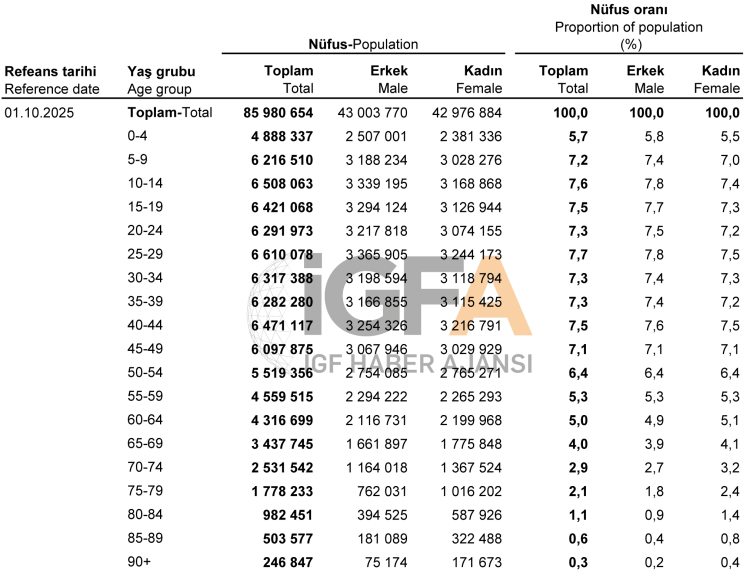 1 Ekim 2025 tarihi itibariyle Türkiye’nin yaş grubuna göre toplam erkek ve kadın nüfusları ile nüfus oranları şöyle oldu:
